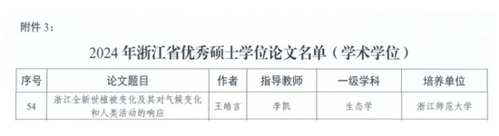 近日,2024年浙江省研究生优秀学位论文评选结果正式公布。生科院李凯教授指导的2024届硕士研究生王皓言的学位论文《浙江全新世植被变化及其对气候变化和人类活动的响应》,顺利通过学会的形式审查、通讯评审、会议评审等程序,被评为省优秀硕士论文。