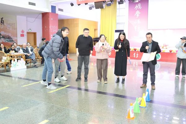 这是一场速度与反应的比拼。老师们在口令声中跳跃、前进,仿佛回到了童年时光。大家你追我赶,现场气氛紧张又刺激。